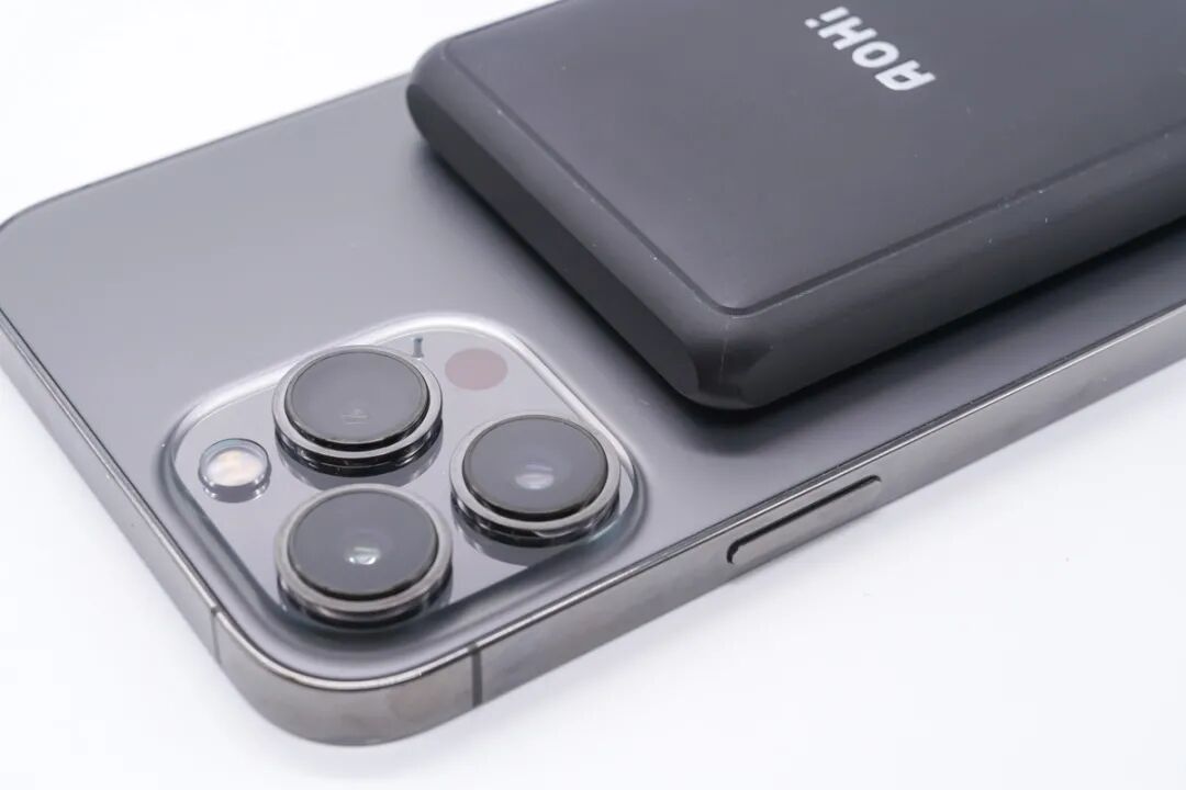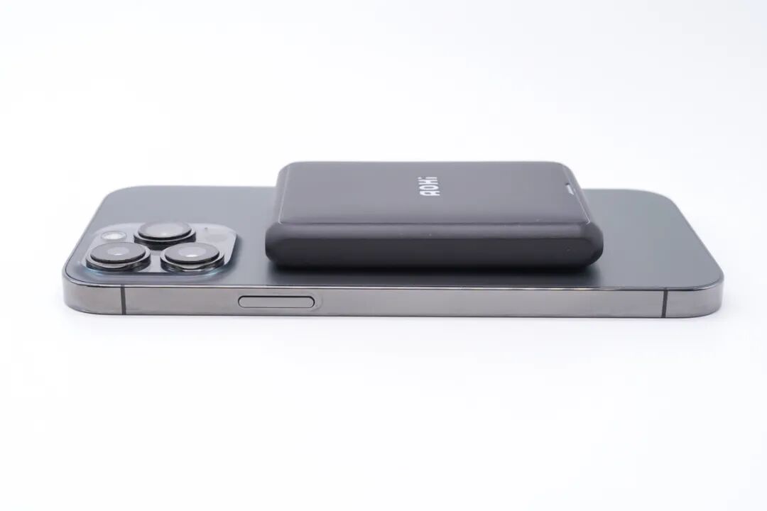 从侧面看一下,对于iPhone 13 Pro Max,AOHi磁吸无线充电宝非常小巧。