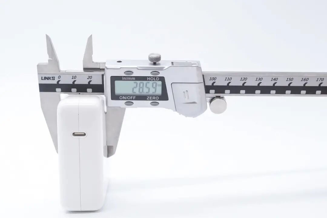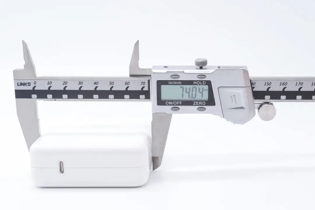 三围方面,使用卡尺实测充电器的长度约为74.02mm(不含插脚)。