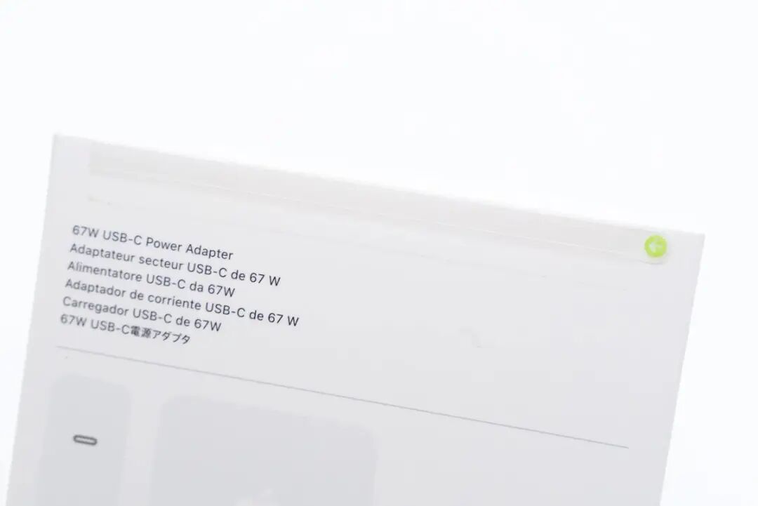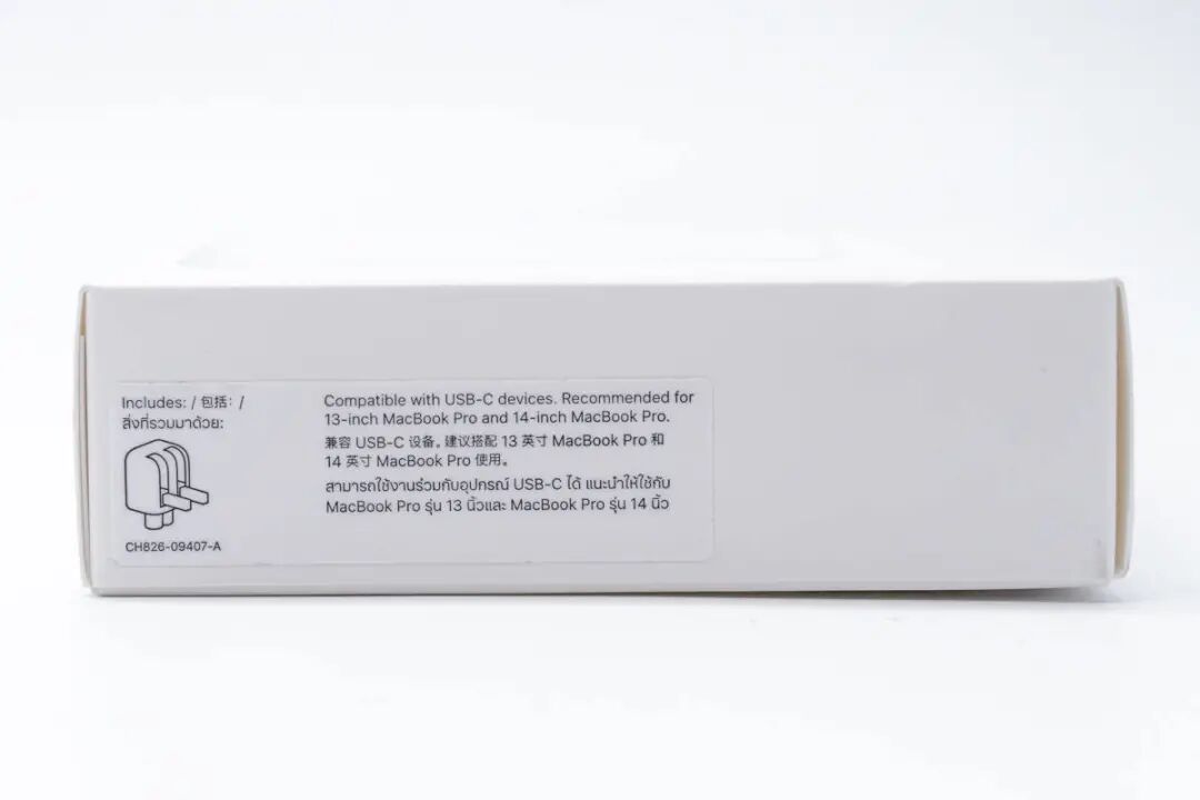 包装盒的侧面标注了充电器兼容USB-C设备,建议搭配13英寸MacBook Pro和14英寸MacBook Pro使用。
