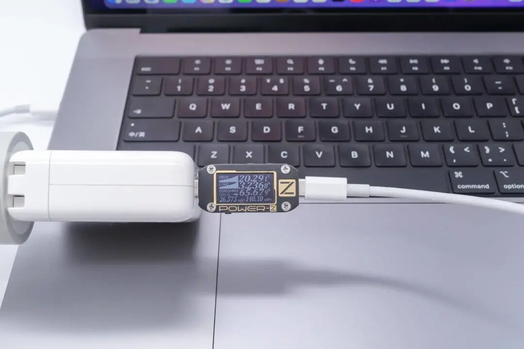 充电全程测试环节可以清楚的看到充电过程中参数的变化,所以此次选择了使用苹果67W PD充电器为MacBook Pro 16 M1 Max充电,来看看充电全程中数据的变化情况。