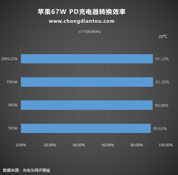 110V 60Hz下,充电器的转换效率从89.63%到91.12%不等。
