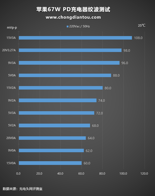 这是使用苹果67W PD充电器在220V 50Hz交流输入下的纹波测试,纹波测试分为空载(柱状图中Y轴电流为0A)和重载(柱状图中Y轴电流为非0A)两种。纹波最高为108mVp-p,充电器处于15V3A输出状态;最低为60mVp-p,充电器处于15V0A空载状态。