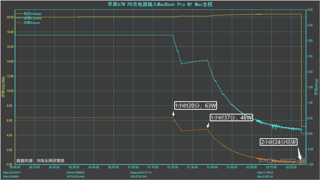 这是使用苹果67W PD充电器为MacBook Pro 16 M1 Max充电的全程数据变化,整个过程分为三个阶段,于2小时24分充电结束,最高功率为20.01V 3.18A 63.66W。