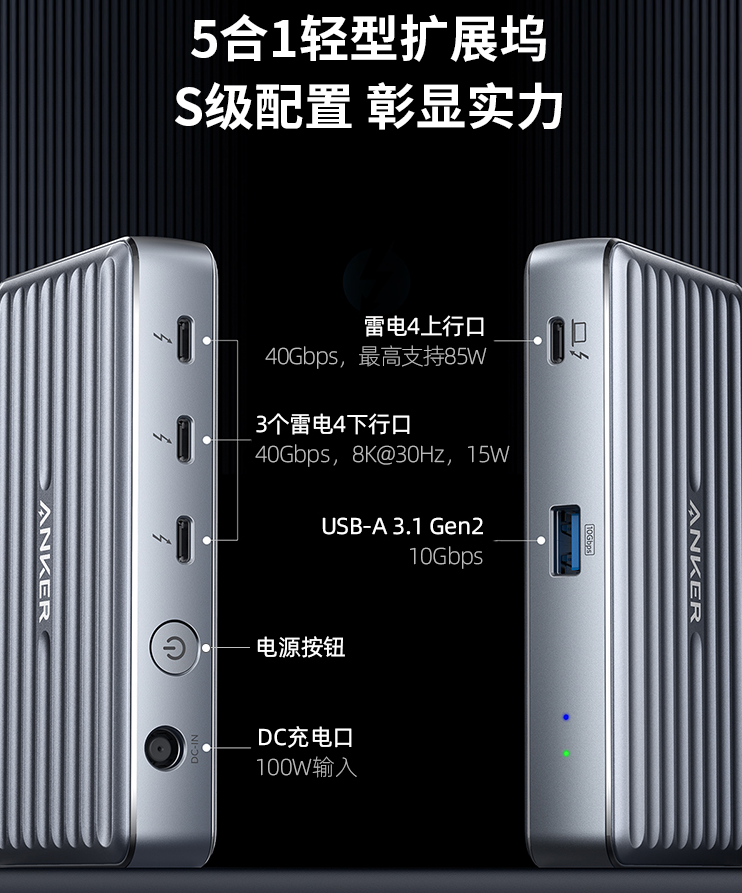Anker 这款拓展坞同时支持雷电4和 USB4 协议,简洁的造型下有着强劲的性能。随机附赠100W电源适配器,支持为笔记本拓展的同时,为笔记本PD充电。