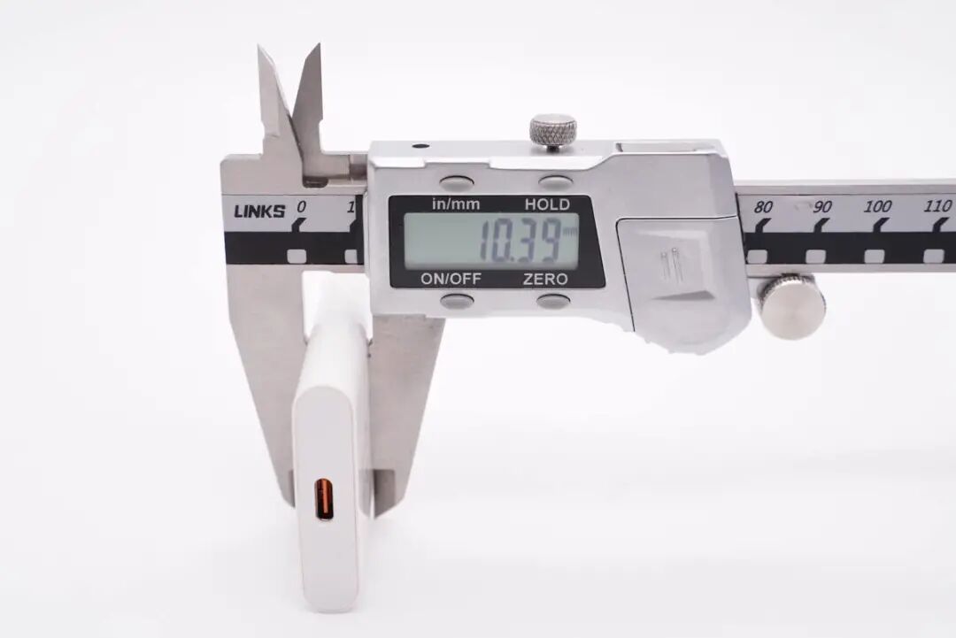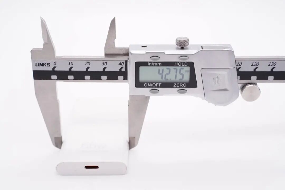 三围参数这里,使用卡尺实测华为66W超薄氮化镓充电器的长度约为80.07mm。