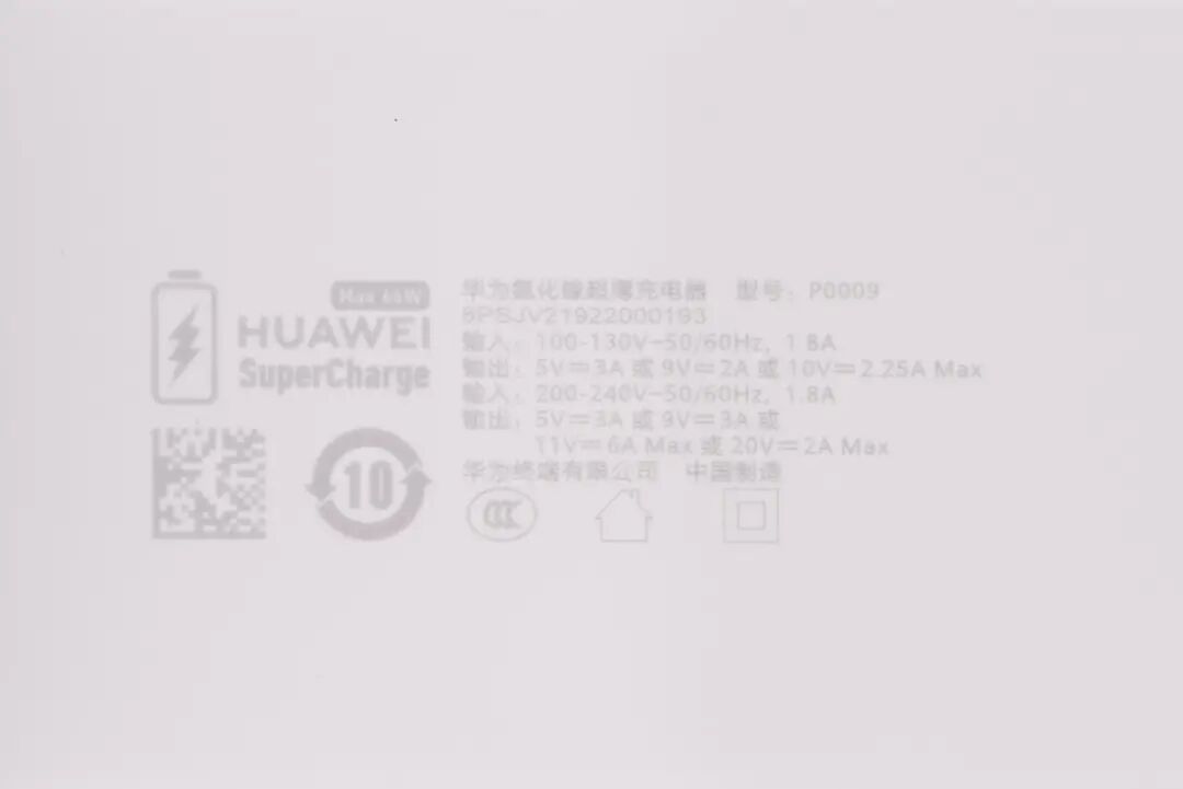 壳体上面印着具体的参数信息,华为66W氮化镓充电器的具体型号为P0009,支持100-240V的宽电压输入,不过输出方面有一些区别。
