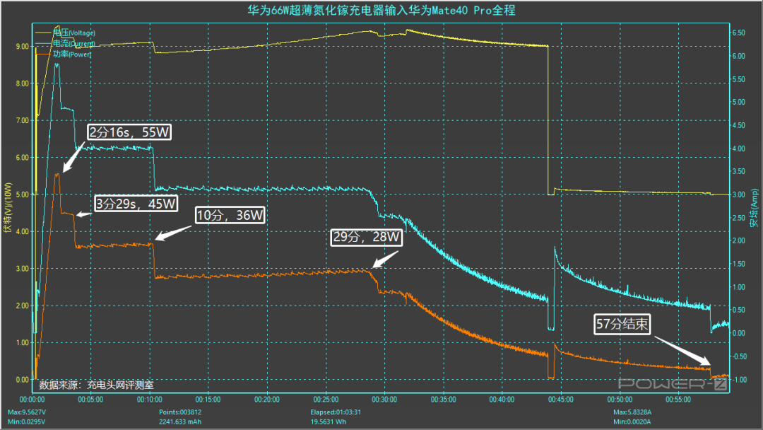 这是使用华为66W超薄氮化镓充电器为华为Mate40 Pro的充电全程,整个过程分为五个阶段,全程耗时约57分,最高功率为9.56V 5.82A 55.73W。