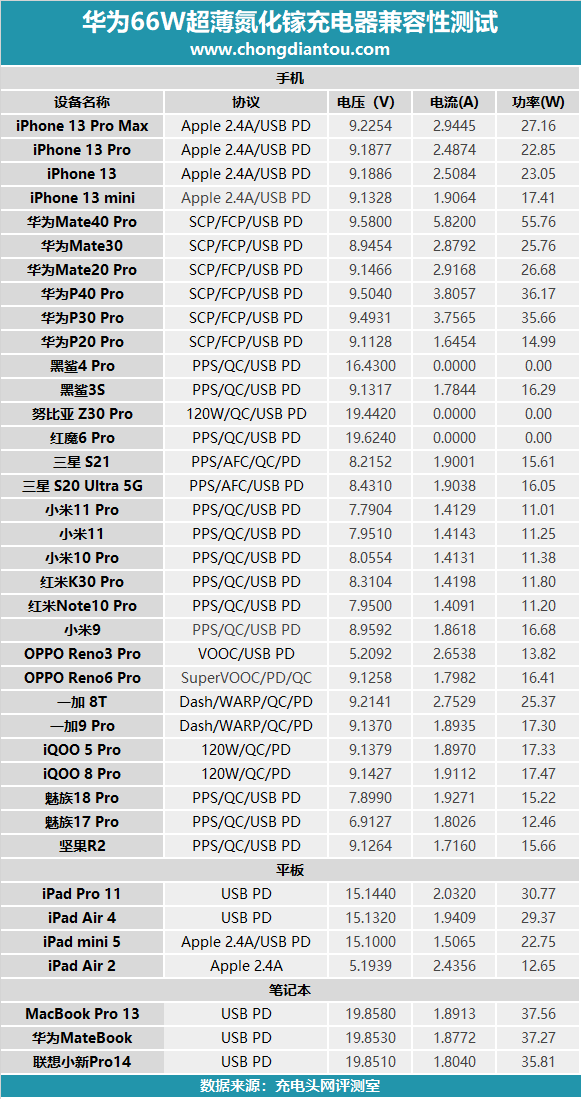兼容性测试环节可以清楚的得知华为66W超薄氮化镓充电器为各个设备的充电情况,充电头网会使用数十款设备搭配华为66W超薄氮化镓充电器进行测试,为读者呈现真实的测试数据。