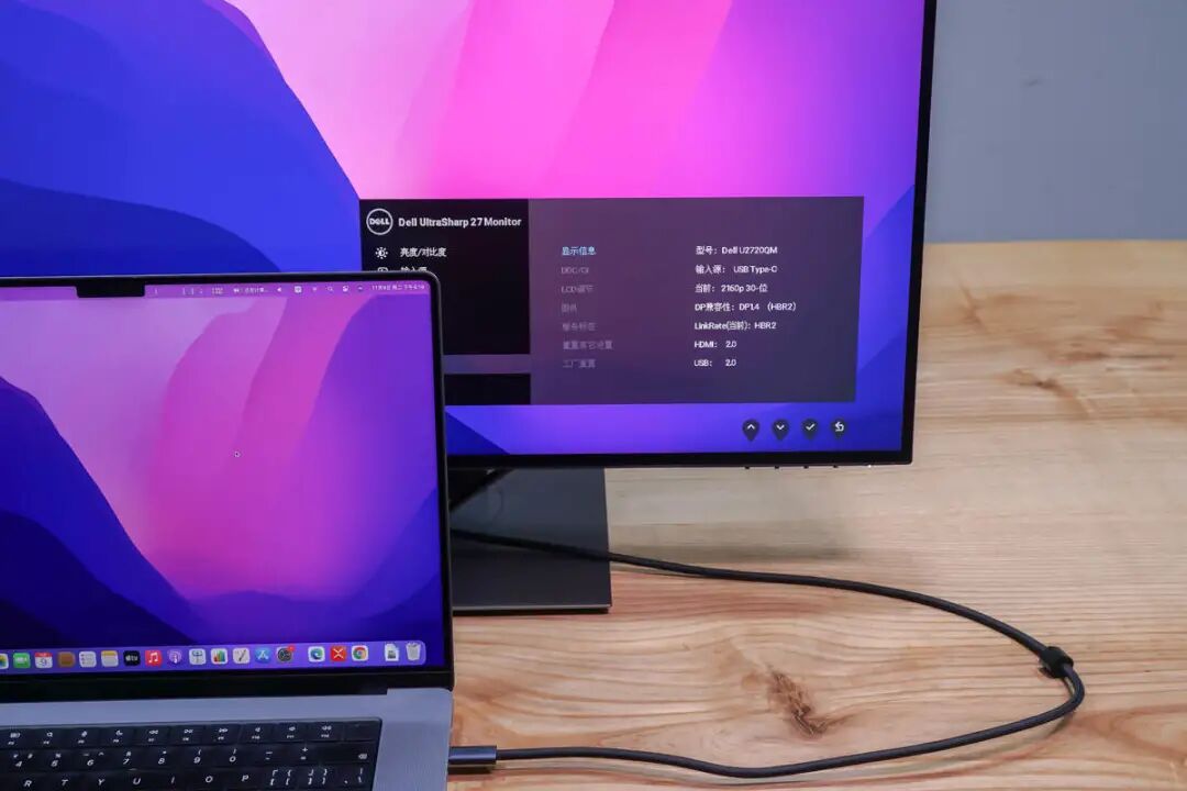 既然支持40Gbps的传输速度,为笔记本拓展自然不在话下,这里使用 MacBook Pro 16 M1 Max 连接4K显示器,画面清晰锐利,显示分辨率为2160P(4K),DP兼容性为1.4,倍思 USB4 编织数据线最大支持8K视频拓展,目前市面上的8K显示器还比较少,这里就不再测试。