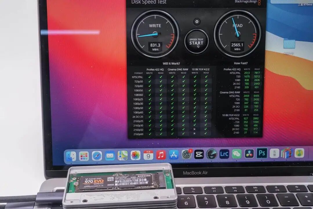 使用阿卡西斯雷电3硬盘盒加三星970EVO固态硬盘搭配线材连接MacBook Air,使用DiskSpeedTest测试读写速度,实测写入速度约831.3Mb/s,读取速度约2565.1Mb/s,达到了这款SSD的最大读取速度。