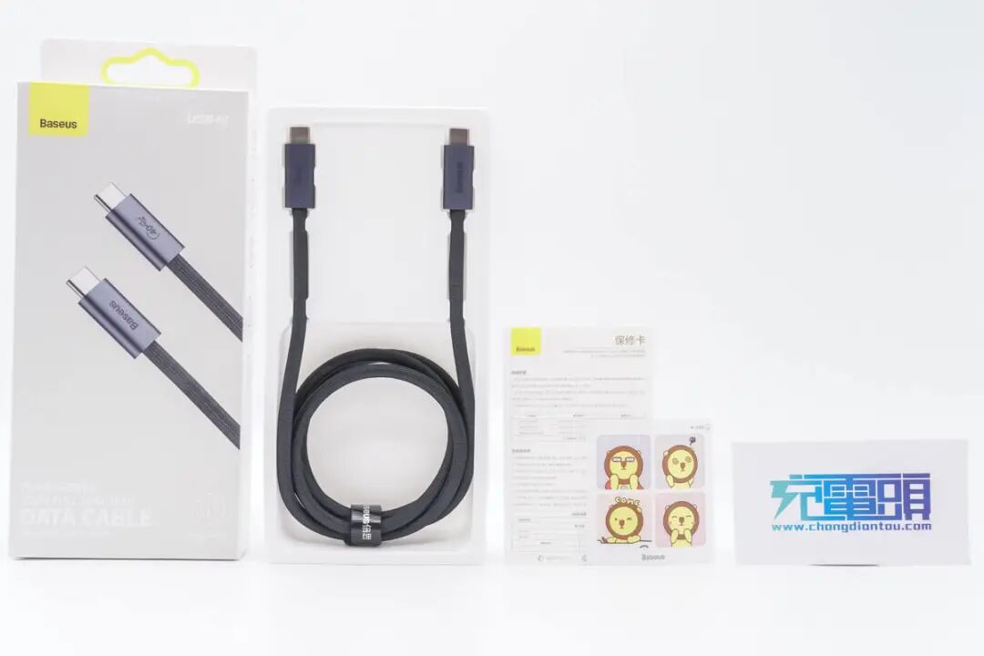 打开包装,倍思 USB4 数据线通过塑料托盘固定,里面还有保修卡和贴纸。