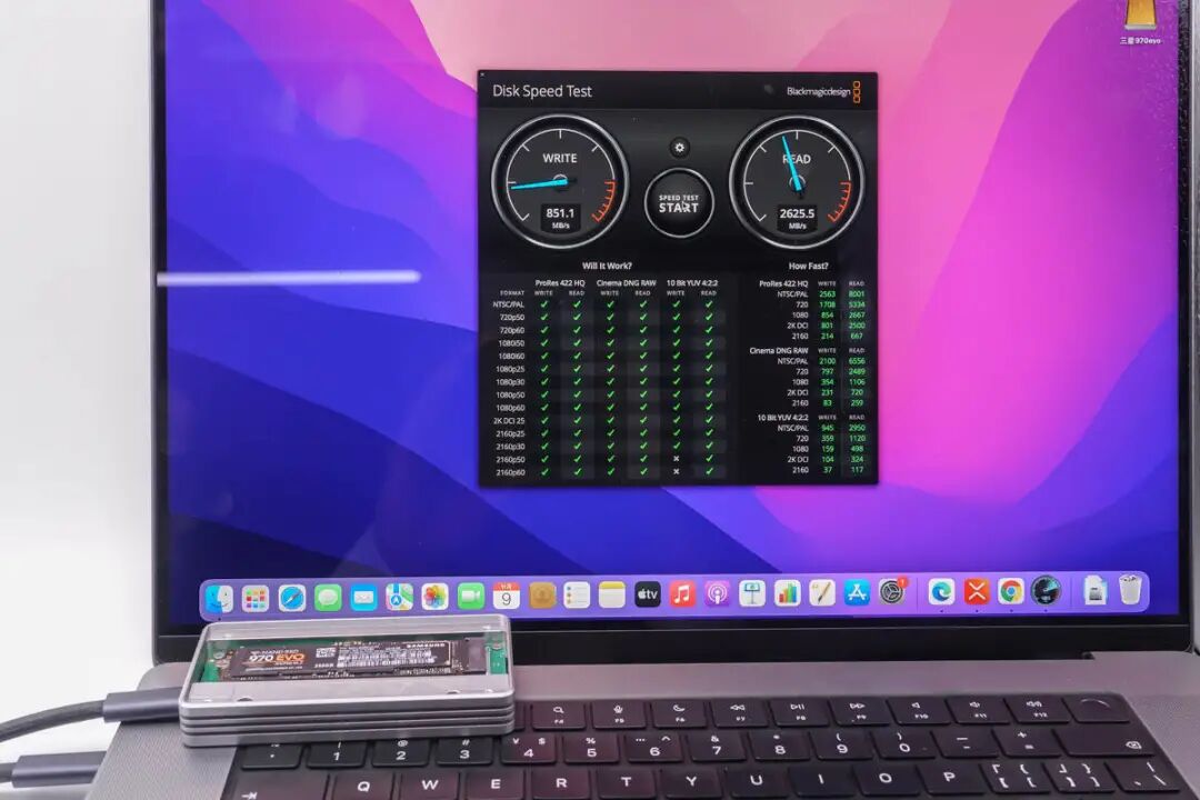 使用阿卡西斯雷电3硬盘盒加三星970EVO固态硬盘搭配线材连接MacBook Pro M1 Max,使用DiskSpeedTest测试读写速度,实测写入速度约 851.1Mb/s,读取速度约2625.5Mb/s。