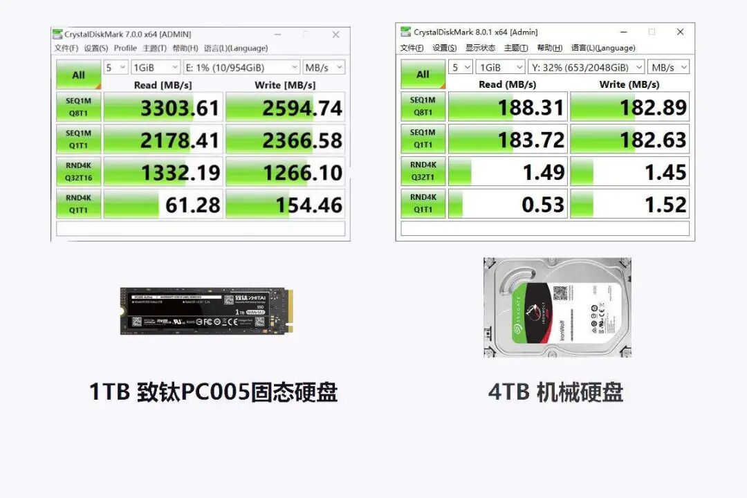 致钛PC005固态硬盘单队列4k小文件读取61.28MB/s,写入154MB/s;机械硬盘单队列4k小文件读取0.53MB/s,写入1.52MB/s。假设打开QQ软件需要读取60MB数据,致钛PC005固态硬盘可以做到双击即可秒开,而机械硬盘往往长达数十秒。