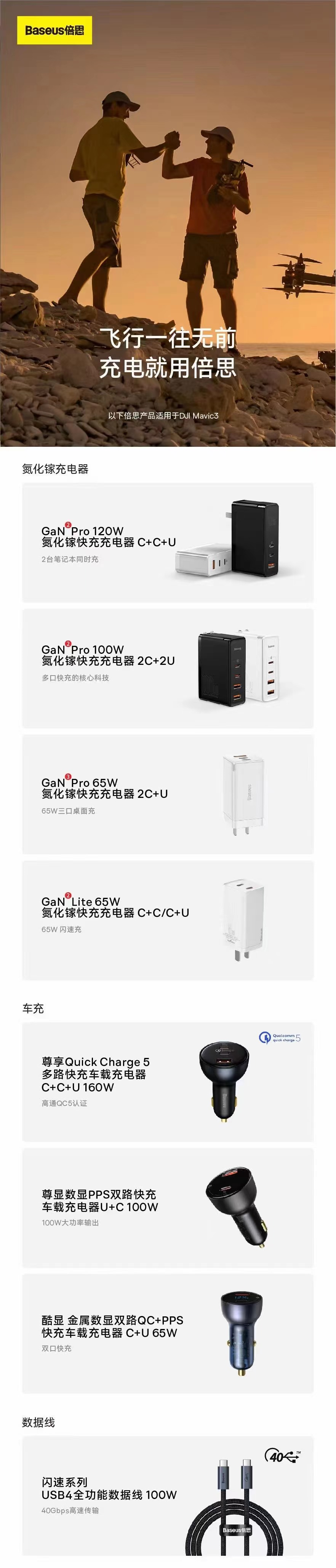 近日,专注于氮化镓快充的倍思为DJI Mavic 3系列无人机准备了一系列快充配件,全部都满足Mavic 3的快充性能需求,覆盖充电器、车载充电器、数据线三大系列,全部具备多接口、高功率、多协议等优势,除保障Mavic 3充电外,用户其他数码配件也照顾到了,一个充电器充所有。