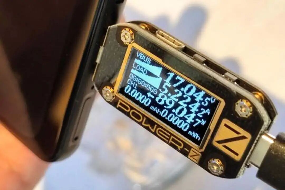 在展示台上使用倍思QC5氮化镓充电器对支持QC5的手机充电,插入后即握手QC5快速充电标准,电压攀升至17.04V,电流5.22A,功率高达89.04W,甚至比一些笔记本充电功率还要高,QC5快充实属强悍。