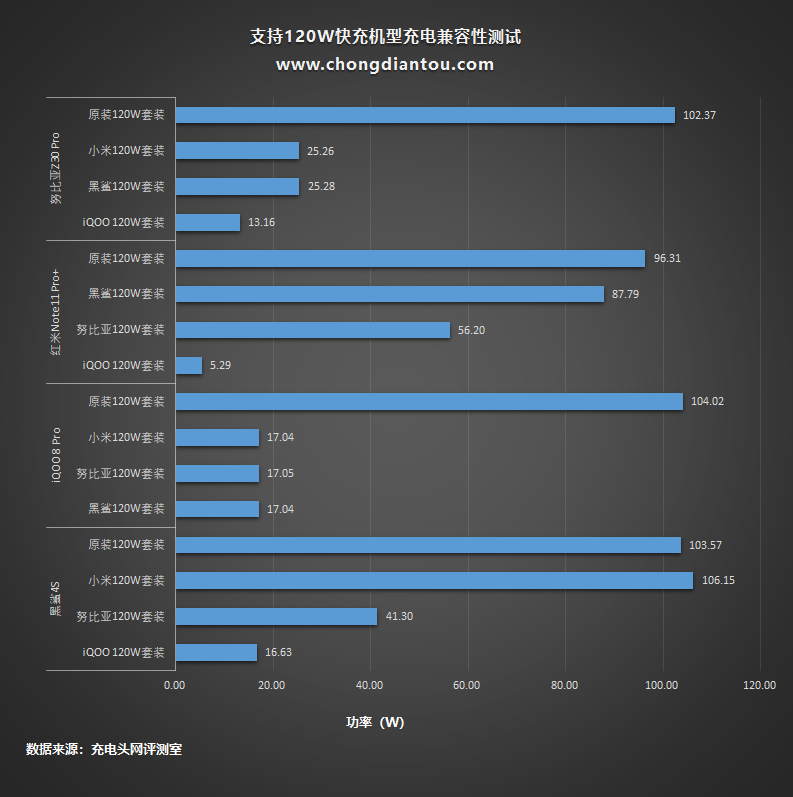 为了回答这个问题,本次充电头网准备了四款支持120W充电的机型和快充套装,分别是黑鲨4S、iQOO 8 Pro、红米Note11 pro+、努比亚Z30 Pro,四款机型和充电套装交叉充电测试功率,究竟兼容性如何?赶紧来揭晓答案。