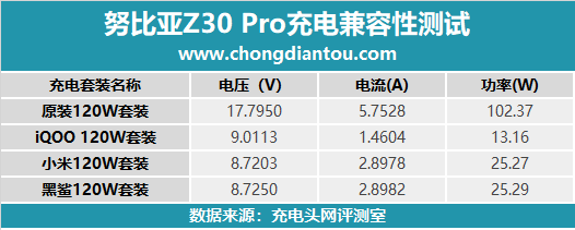 四套充电器对努比亚Z30 Pro 充电的功率如上表,虽然自家充电器对别家手机兼容性不错,但手机对别家充电器却没什么兼容性,充电器大厂实锤了。