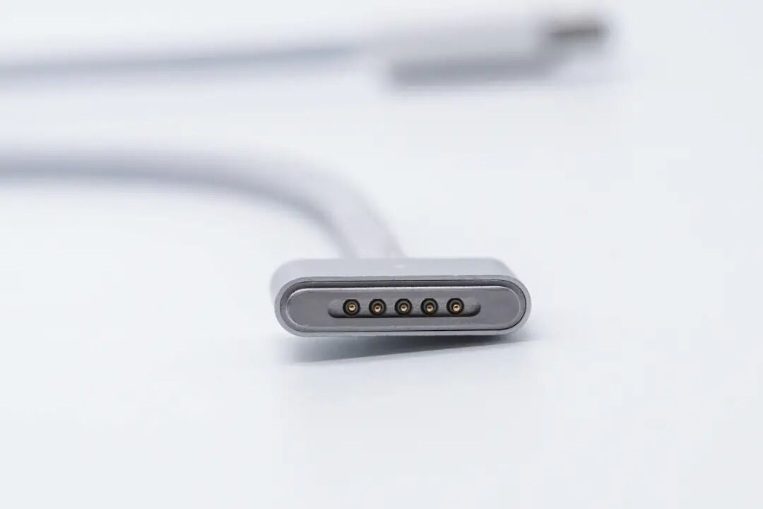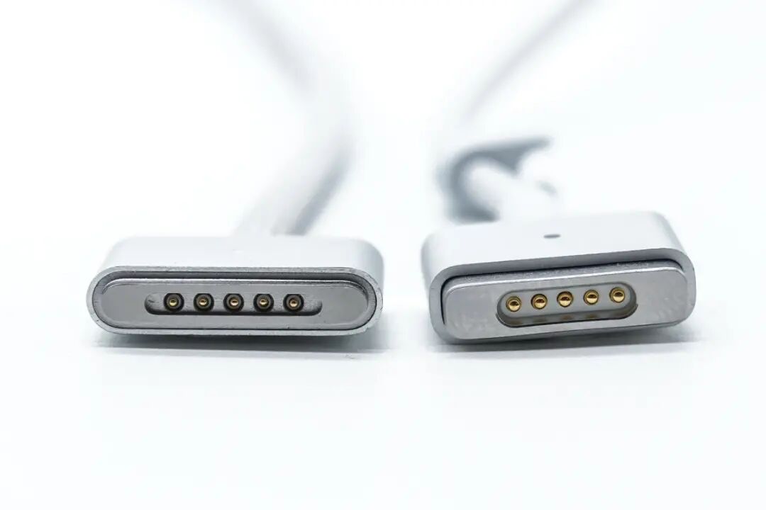 左侧为 MagSafe 3,右侧为 MagSafe 2,新款比老款接头更修长了,边角更加圆润,同样为五个弹簧触点。