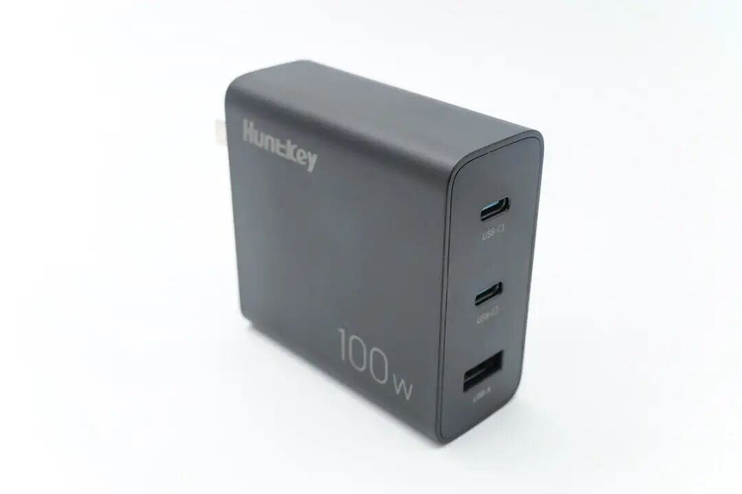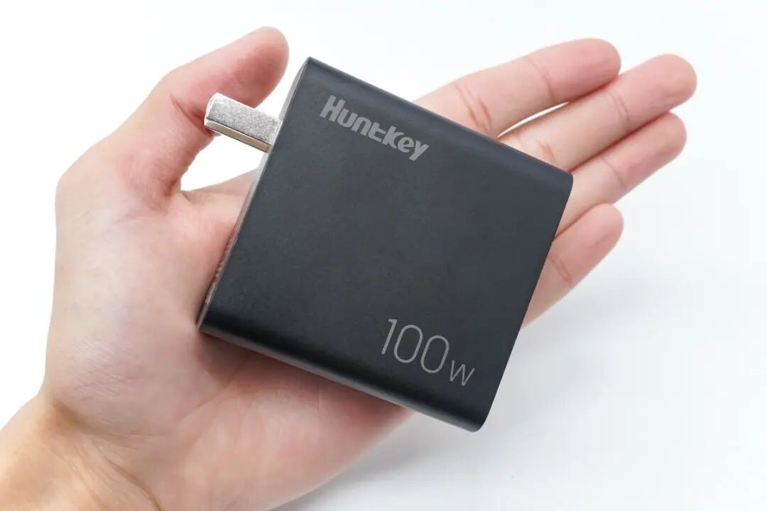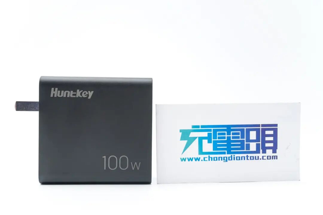 航嘉100W氮化镓双认证安全快充正面相当简洁,Huntkey+100W 的字样表面真身。