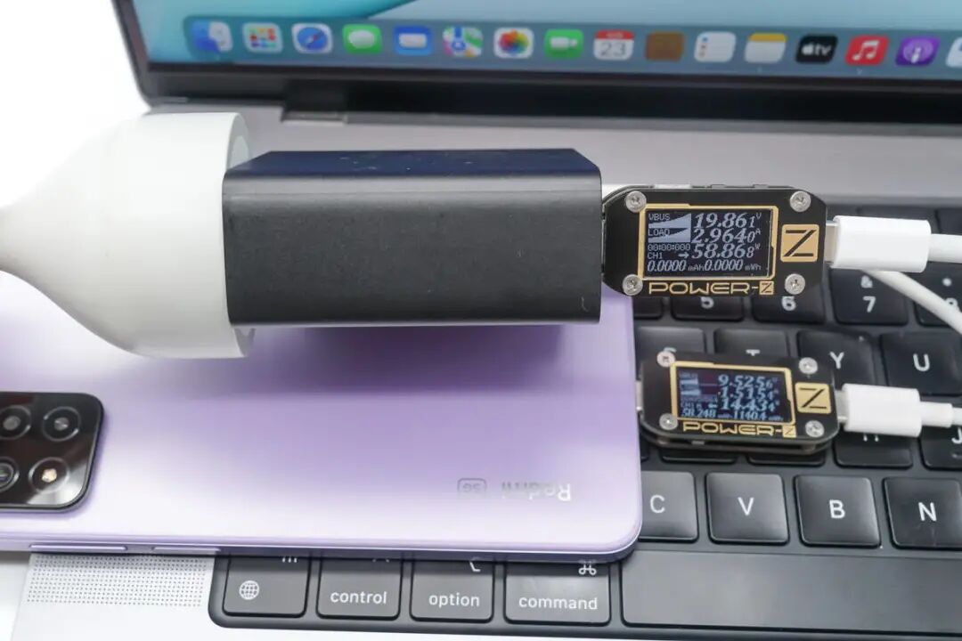 双口同时为红米Note11 Pro+ 和 MacBook Pro 16 充电,功率分别为14.43W和58.86W,合计功率约为73.29W。