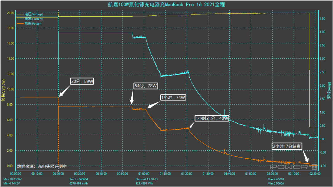 充电全程电压维持在20V左右,充电前20分钟,功率维持在最高89W左右,1小时21分阶梯下降至48W,然后进入涓流充电模式,全程耗时2小时17分。