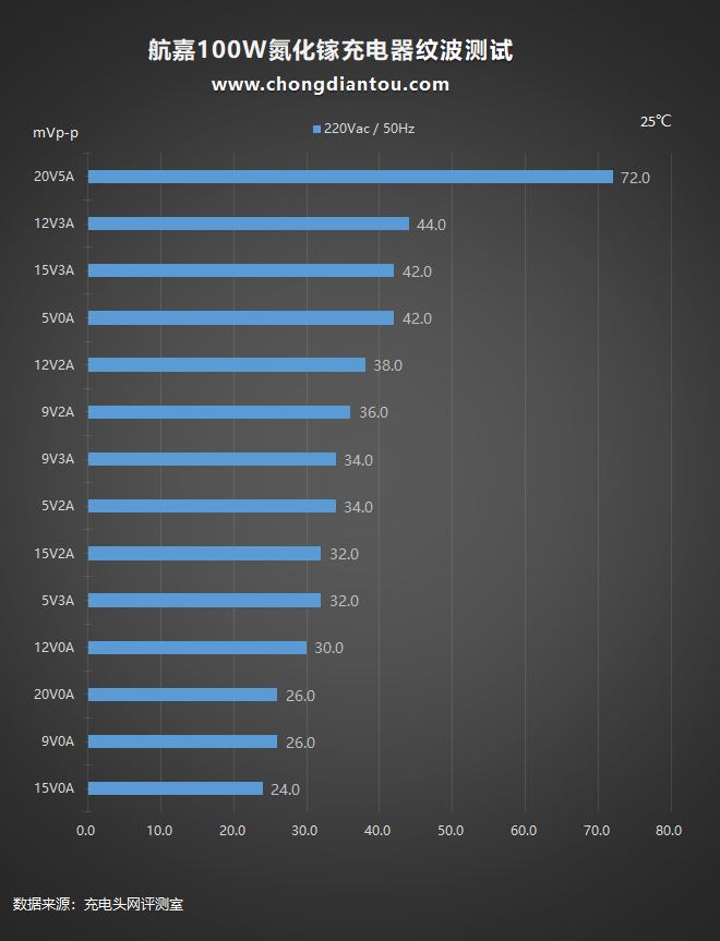 110V 60Hz下最高为86mVp-p,充电器处于20V5A输出;最低为20mVp-p充电器处于12V0A空载。