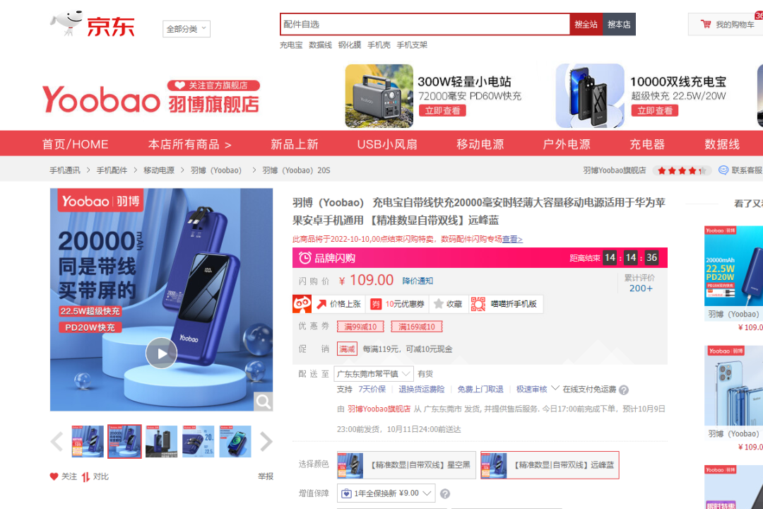 https://detail.tmall.com/item_o.htm?id=672416880653https://www.miaomiaozhe.com/coupon/-5146934646924198568/672416880653羽博自带双线移动电源,机身背后自带两根数据线, 外出无需带数据线更方便。USB-C 数据线输出功率 18W,带有 5V4.5A / 5V3A / 9V2A / 12V1.5A 电压档,适用于大部分消费电子产品;Lightning 数据线输出功率 20W,带有 5V3A / 9V2.22A / 12V1.5A 电压档,iPhone 13 半小时充入 50% 电量;机身上还有 USB-C 18W 快充输入接口、USB-A 22.5W 快充输出接口。内置电池容量为 20000mAh,机身表面内藏一个百分比电量显示屏。