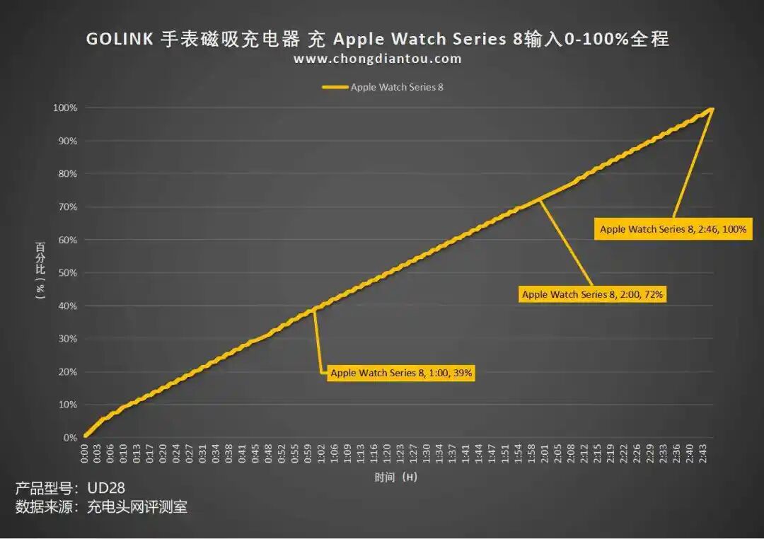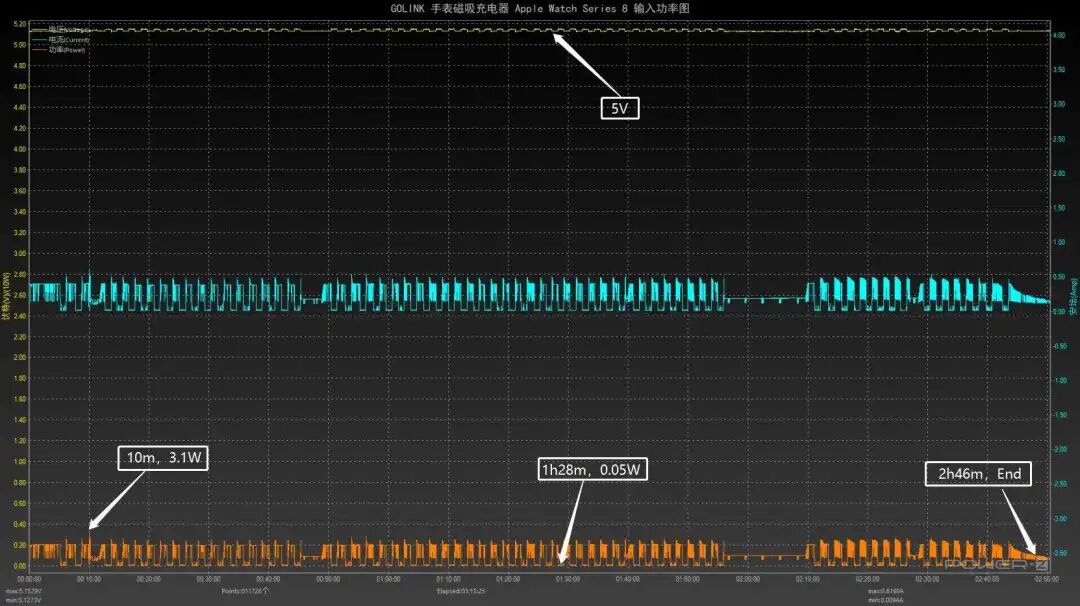 针对GOLINK 手表磁吸充电器,此次测试的目标是Apple Watch Series 8,将 GOLINK 手表磁吸充电器和苹果原装35W双USB-C充电器(A2579)放在25℃的恒温箱中,Apple Watch Series 8则吸附在磁吸区域内,下图是实测数据:这是使用GOLINK 手表磁吸充电器和苹果原装35W双USB-C充电器(A2579)进行充电,从测试数据中可以看出,充电过程中功率比较有规律,呈脉冲式;测试过程中最低功率0.05W左右,最高功率3.1W左右;一个循环过程约两分钟,如此循环多次,直至充满;总耗时约2小时46分左右。将充电全程绘制成曲线图,可以看出这款 GOLINK 手表磁吸充电器为Apple Watch Series 8一小时充电39%,两小时充电72%,完全充满需要2小时46分。