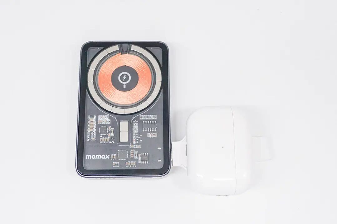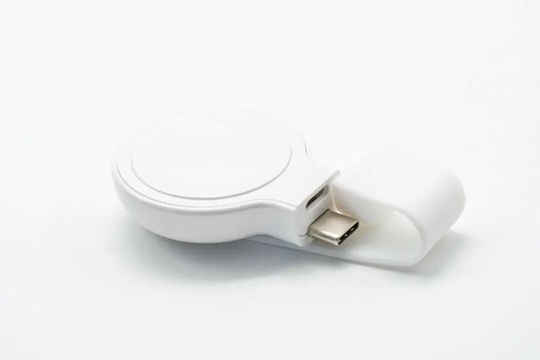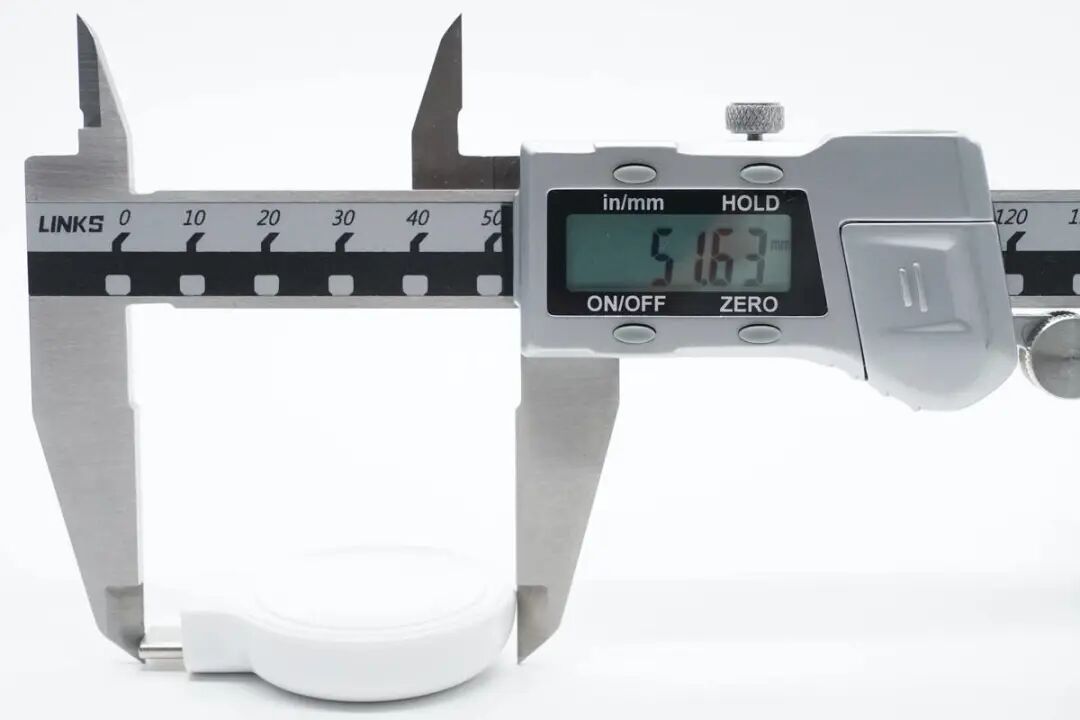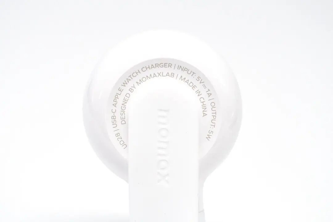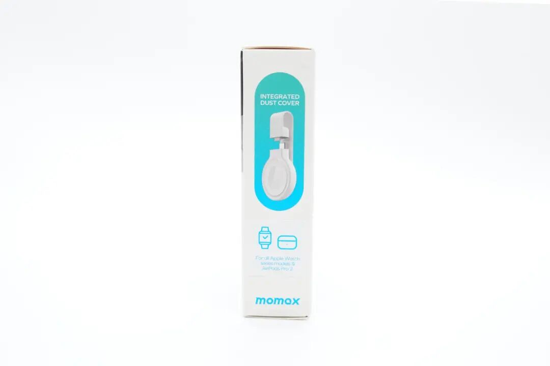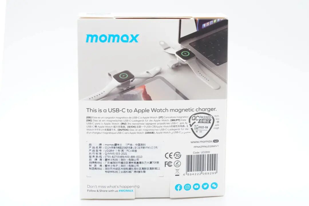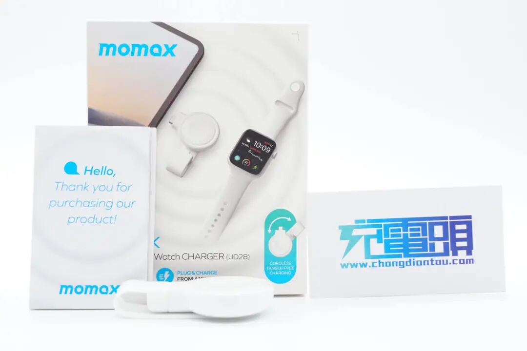按照惯例,先看包装。包装盒为MOMAX 一贯简约蓝白设计风格,正面印有手表充电器使用场景图示,可连接平板对手表进行充电;另外这款手表充电器名称字样“ GOLINK USB-C Apple Watch Charger”,并拥有MFW认证;右下角蓝色圈内图示表明防尘保护套可自由旋转角度,这点也已经在场景图上有所展示。背面印有产品搭配笔记本、平板等使用场景图示,下部分印有多语产品释义。名称:GOLINK苹果手表磁吸无线充电器(以下简称 GOLINK 手表磁吸充电器);型号:UD28;右侧印有产品条形码以及FCC、CE等认证标识;制造商:爱米士电子(深圳)有限公司;品牌商:摩米士科技(深圳)有限公司。侧面印有防尘塞开启外观图以及兼容设备说明,可对全系Apple Watch进行无线充电以及AirPods Pro 2进行无线充电,测试部分也将会进行验证。取出包装内所有物品,除手表充电器外,另附赠安全讯息卡、说明手册以及产品展示手册。GOLINK 手表磁吸充电器正面磁吸部分镶嵌在PC外壳中,原装磁吸充电模块部分中间为凹陷圆弧亮面设计,使得Apple Watch凸起的玻璃表背更加贴合。GOLINK 手表磁吸充电器背面印有相关参数铭文。型号:UD28;输入:5V1A;输出:5W。此外,GOLINK 手表磁吸充电器防尘塞上印有MOMAX品牌字样,并且硅胶防尘塞可自由旋转任意角度,也可自行取下,方便清洗;充电器采用一体式USB-C端口设计,可直接连接搭载USB-C端口的充电器使用,无须担心物理兼容端口的问题。GOLINK 手表磁吸充电器长度约为51.63mm。GOLINK 手表磁吸充电器磁吸区域宽度约为39.66mm。GOLINK 手表磁吸充电器磁吸区域厚度约为10.93mm。与Apple Watch Series 8原装充电器相比较而言,GOLINK 手表磁吸充电器磁吸区域与原装体型无区别。