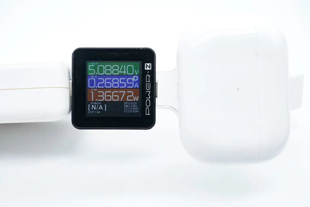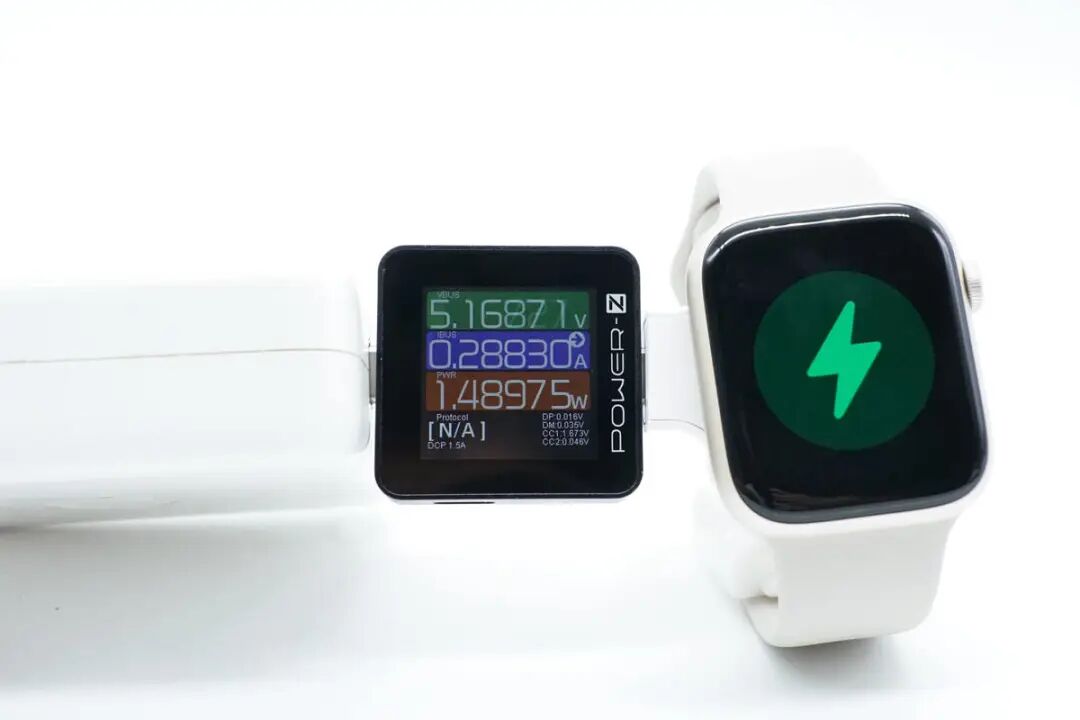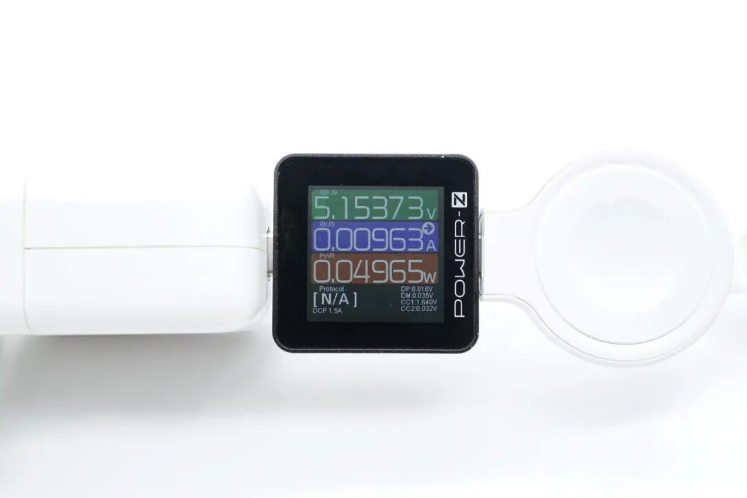 GOLINK 手表磁吸充电器拥有原装磁吸模块,那自然要测试 AirPods 以及 Apple Watch 的实际充电功率表现如何。首先是空载功耗方面,GOLINK 手表磁吸充电器整体功耗为0.05W,可忽略不计。搭配苹果35W充电器(A2676)对Apple Watch SE 2进行充电,实测GOLINK 手表磁吸充电器输入端功率为5.17V 0.29A 1.49W。搭配苹果35W充电器(A2676)对Apple Watch Series 8 进行充电,实测GOLINK 手表磁吸充电器输入端功率为5.09V 0.39A 1.97W。搭配苹果35W充电器(A2676)对Apple Watch Ultra 进行充电,实测GOLINK 手表磁吸充电器输入端功率为5.09V 0.4A 2.06W。搭配苹果35W充电器(A2676)对AirPods Pro 2 进行充电,实测GOLINK 手表磁吸充电器输入端功率为5.09V 0.27A 1.37W。
