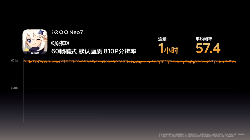 iQOO Neo7 游玩《原神》,在60帧模式 默认画质 810P分辨率下连续玩1小时,实际平均帧率可以稳定在57.4帧。