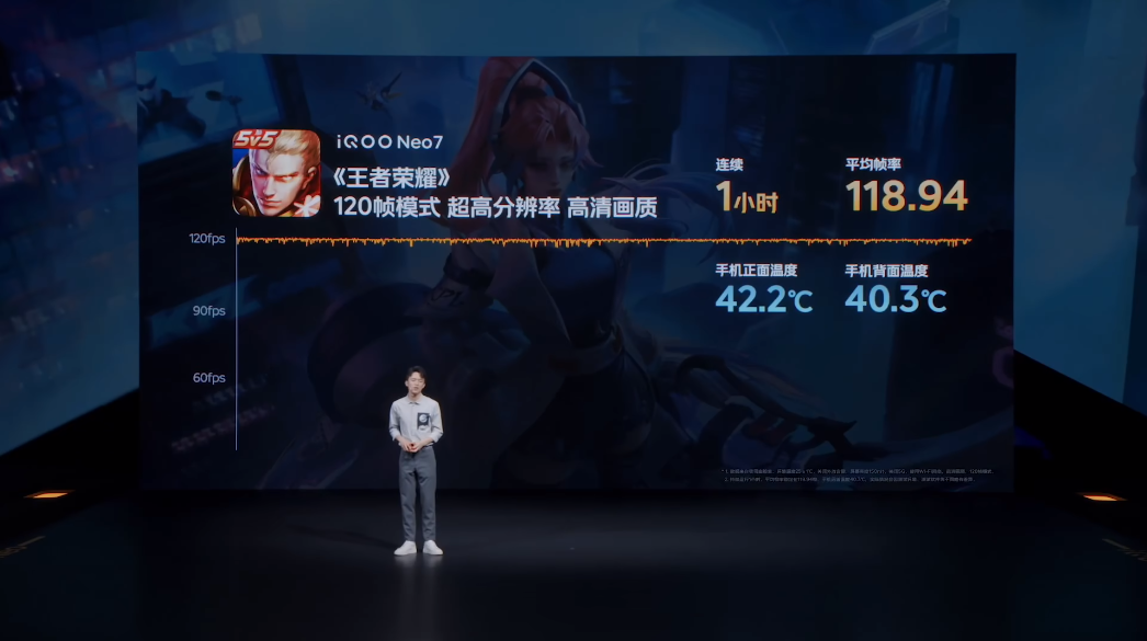 用 Neo7 打《王者荣耀》,在120帧模式 超高分辨率 高清画质下, 可以连续1小时平均帧率做到 118.94 帧,而手机握在手里却仅仅只有40.3℃。在 Neo7 身上实现了流畅、冷静、持久三者兼得。