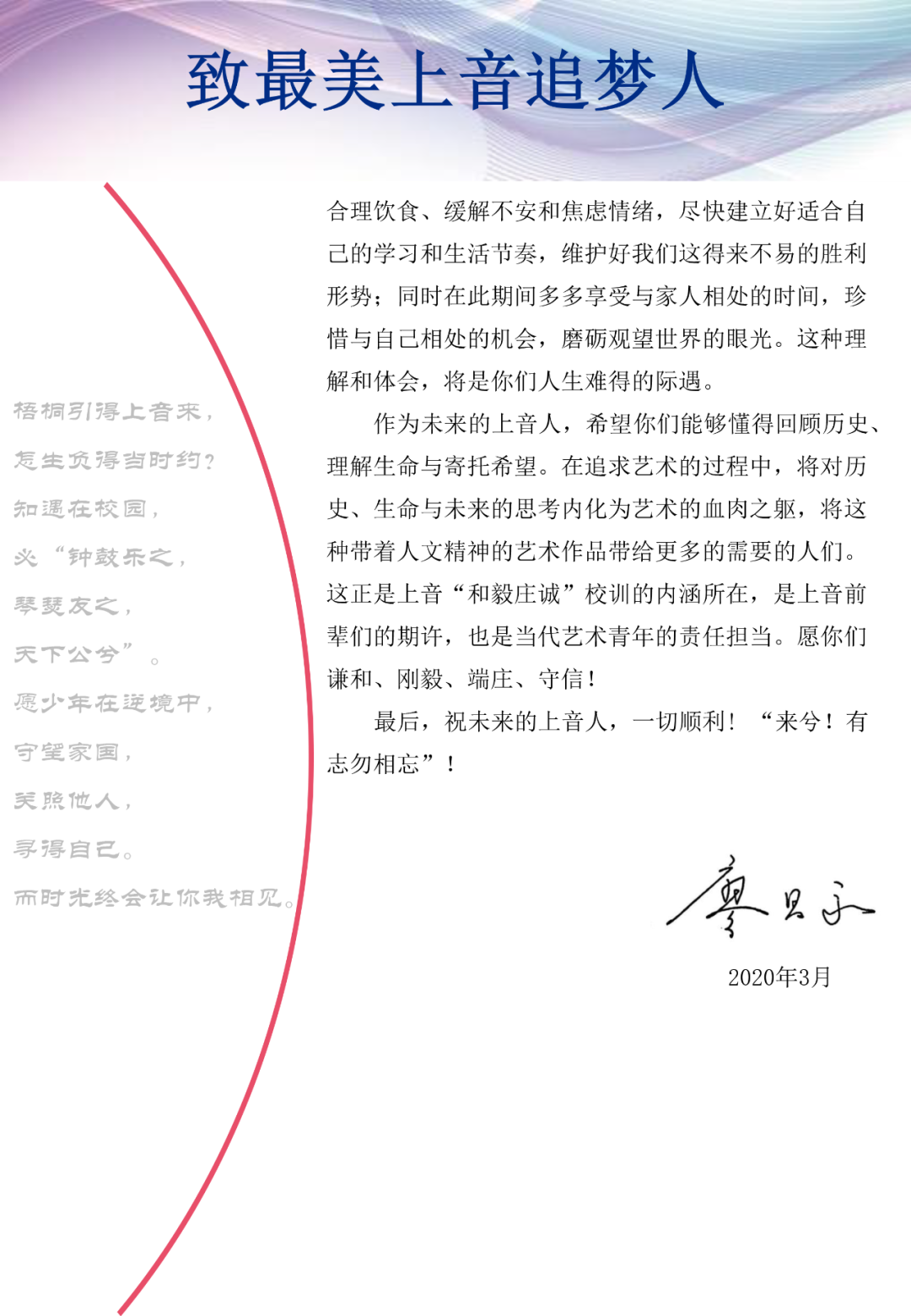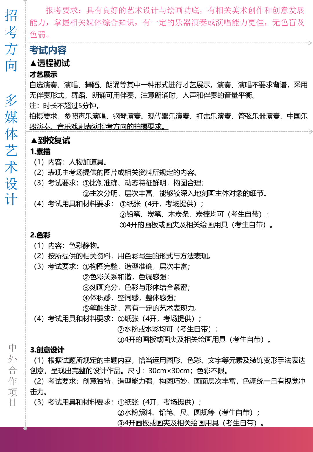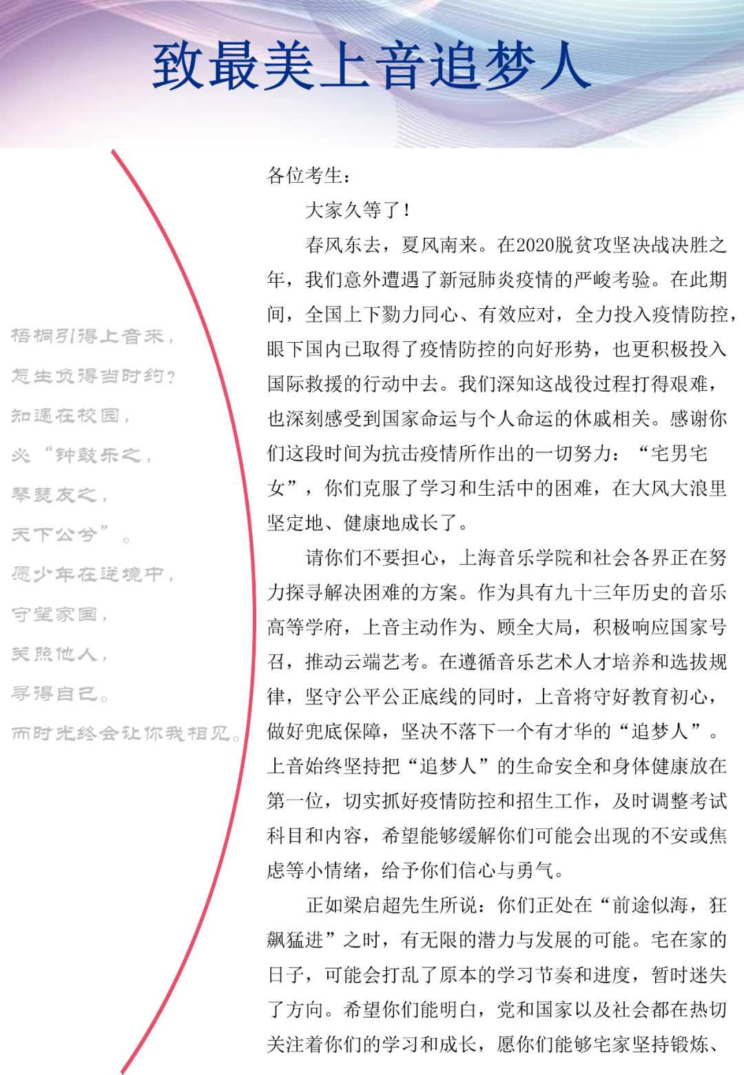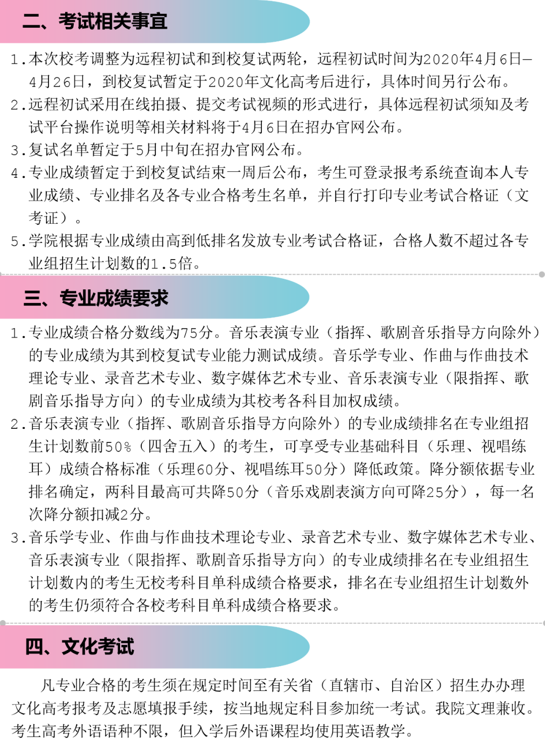 在疫情防控的重要阶段,我校积极响应党和国家号召,推动“云端艺考”,及时调整考试时间、科目和内容。采用“远程初试+到校复试”的方式进行考核。具体请参看下文“招生简章”。