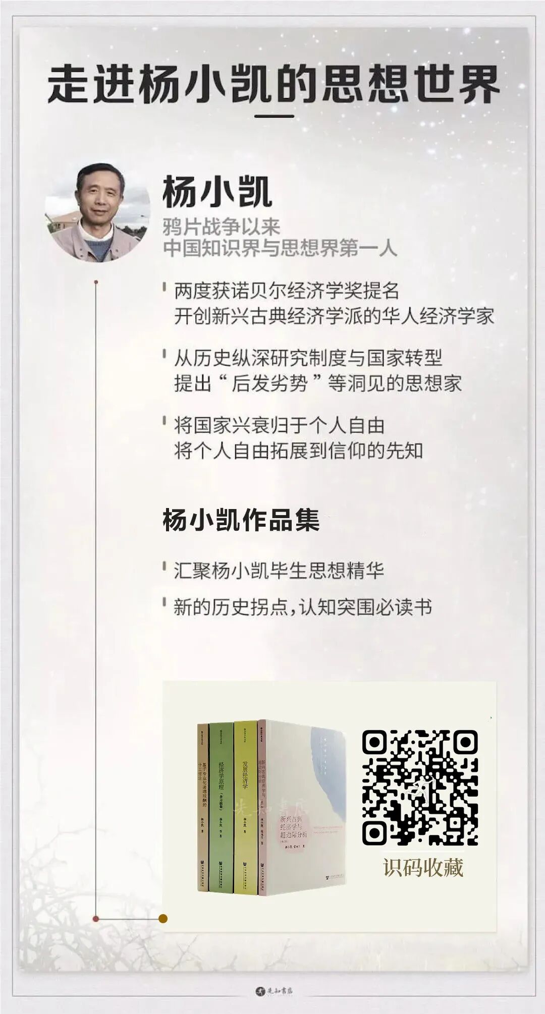 为纪念这位杨小凯,满足书友们阅读、收藏杨小凯作品的愿望,先知书店为您奉上“杨小凯作品集”(4册),长按下图,识别图中的二维码,即可购买收藏。