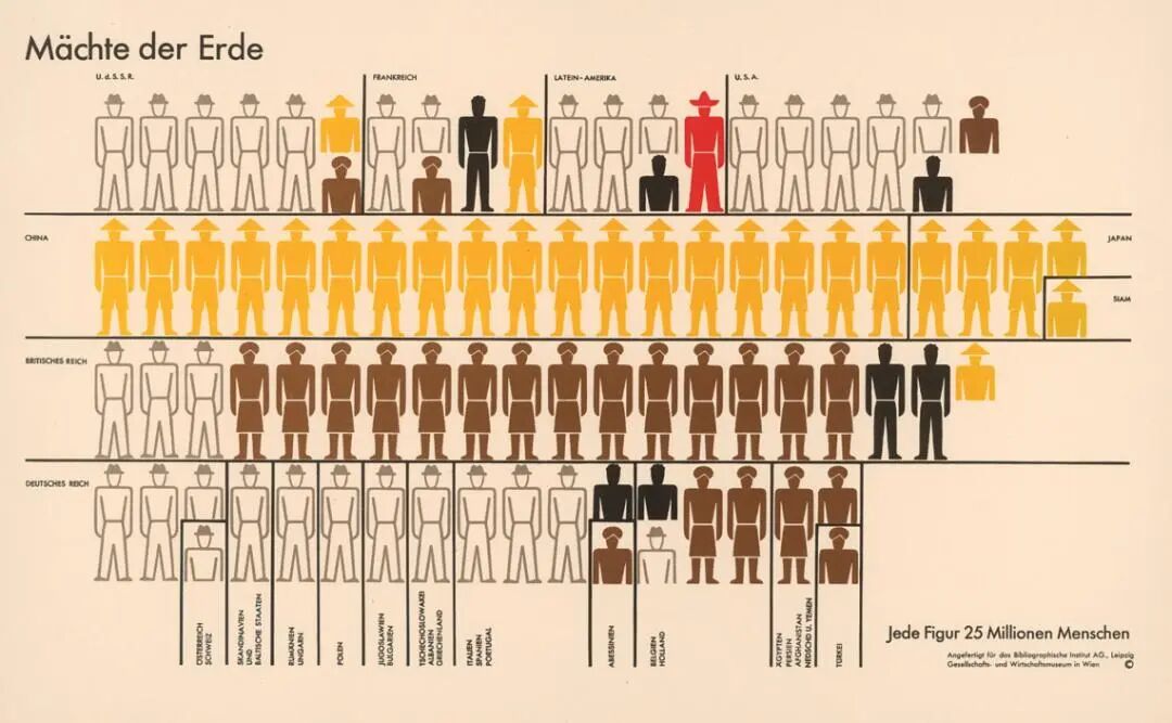 圈子里最有成就的是奥托•尼拉特(Otto Neurath)。在他的哲学之上,他彻底改变了知识的传播,用新的方式把复杂的信息转换成简单的图形:让知识变得容易理解就是让它变得大众民主化。今天使用的所有数据可视化格式都可以追溯到这些“图画文字”(Isotypes,如下一页的示例)。