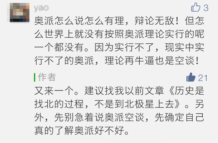 但很遗憾,这并不是奥派所定义的自由,这是作者自己理解的自由。这里他再次瞄准了自己树立的靶子,误以为自己又赢了。很明显,他只是听说奥派强调自由,但他不知道的是奥派更强调产权。自己产权范围内的,不侵犯他人产权的行为,才是真正值得追求的自由。不强调产权的自由,归根结底是「慷他人之慨」,让别人为自己的事情买单。奥派强调产权,也不是出于什么施政主张,根本原因是无产权则无价格,无价格则无市场,无市场则无自由。如果没有产权和基于产权的自由,恐怕不会有微信和微信公号让作者发声并获得市场的奖励。实际上,作者发文的平台和行动本身,就足以证明其文章立论之谬误。「稻草人」的事,完全是一种不谦虚的傲慢,不愿意去了解一个学说的体系。说奥派实际上是蒙古大夫的那位作者,其实和我之前的这位读者犯的是同一个错误。他们都认为,现实中看不到实行奥派治理国家的证据,所以奥派注定是失败的。说实话,这种无知且自信的气质,很多人拿捏的都是一样一样。有多少人能够准确说出,两个轮子的自行车为什么静止下来就会倒下,骑起来反而不会倒?这背后的牛顿力学有多少人清楚?