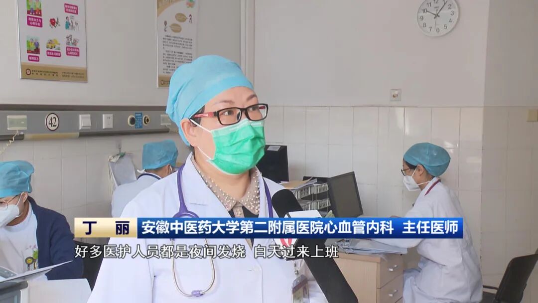 为了应对这段时间新冠病毒感染患者就诊高峰,安徽中医药大学第二附属医院专门成立了由急诊、重症等重点科室带头的医疗救治小组。在心内科病房,仍处于新冠感染恢复期的主任医师丁丽正和同事们一起忙着查房,大家克服身体不适,坚守在岗位上。