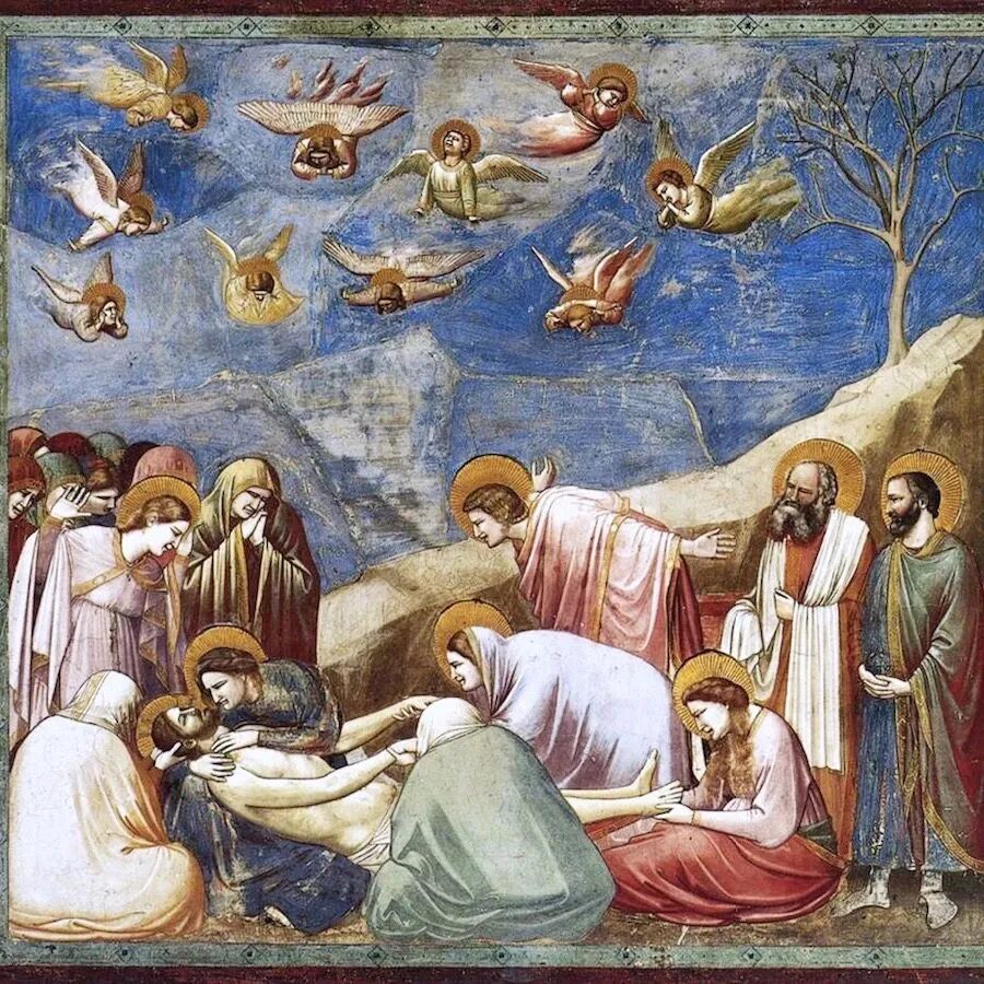 分别为13世纪乔托的壁画(局部)、15世纪达芬奇的圣母、