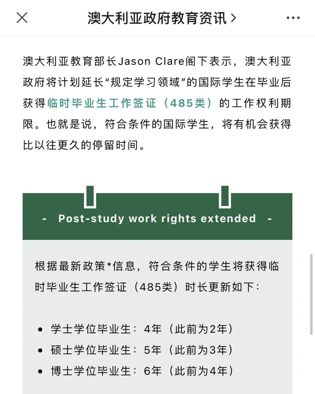 刚刚,澳洲政府的官方微信公众号“澳大利亚政府教育资讯”发布了一篇关于在澳的国际留学生的签证新规的文章。