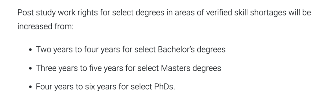 在这份声明中公布,澳大利亚政府将延长留学生的学习后工作权利的期限,以加强保证澳洲技术劳动力的渠道。
