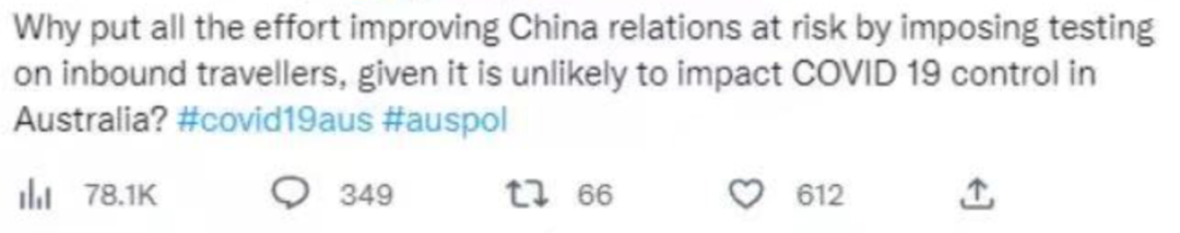 中澳关系好不容易刚刚回暖,难道又要因为澳洲这个决定破裂吗···因为澳政府没有听从卫生官的建议,采取了这一决定,显然不合时宜。据了解,Albanese 政府不顾首席医疗官 Paul Kelly 的明确建议,对来自中国的旅客实施强制性 COVID-19 检测,他告诉政府实施该措施没有“充分的公共卫生理由”。