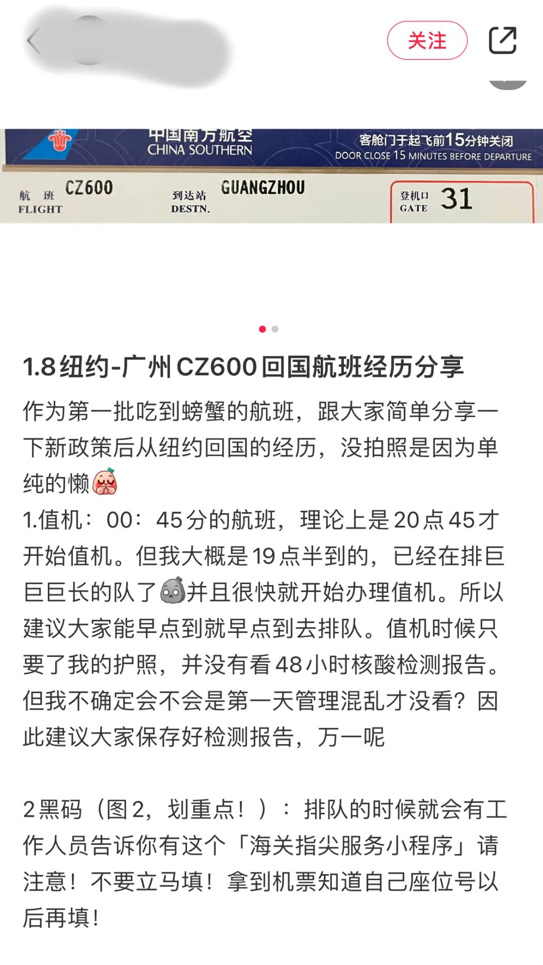 “作为第一批吃到螃蟹的航班,跟大家简单分享一下新政策后从纽约回国的经历。”