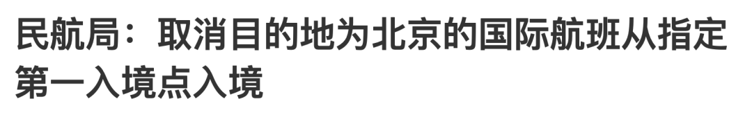 此外,据中国民用航空局网站最新消息,根据《关于对新型冠状病毒感染实施“乙类乙管”的总体方案》和《关于中外人员往来暂行措施的通知》要求,现决定取消目的地为北京的国际客运航班从指定第一入境点入境。