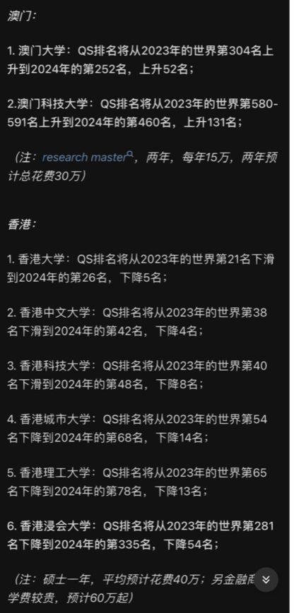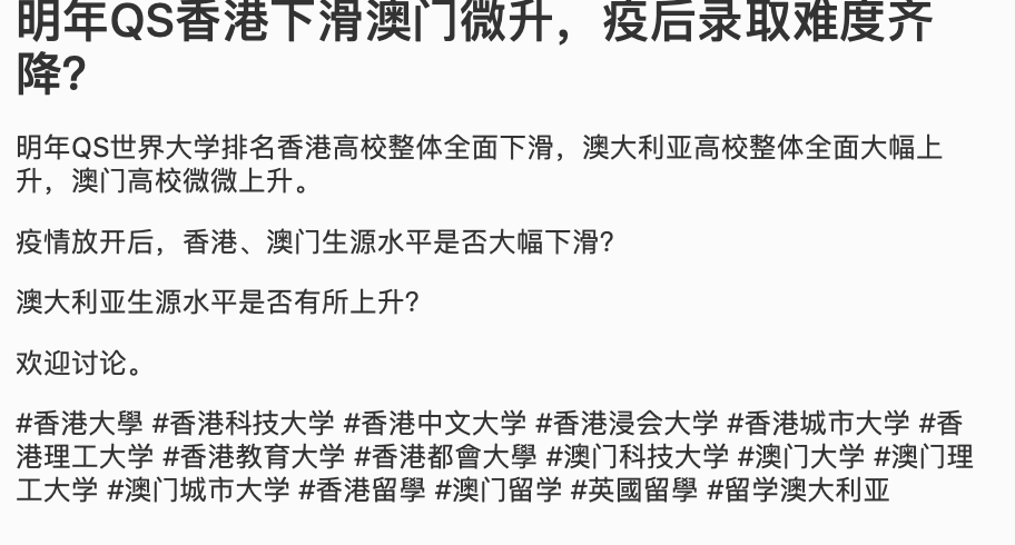 也有另一位小伙伴表示,明年QS世界大学排名香港高校整体全面下滑,澳大利亚高校整体全面大幅上升,澳门高校微微上升。