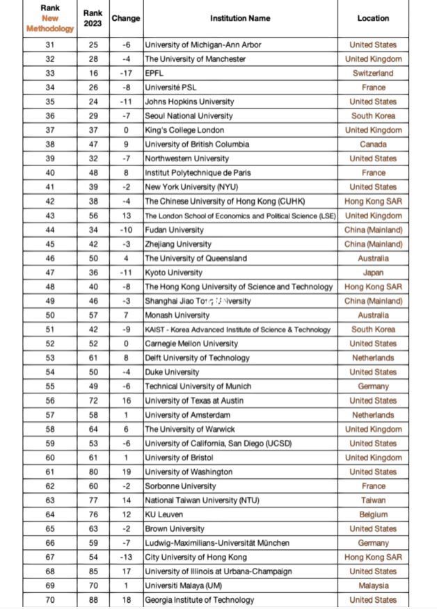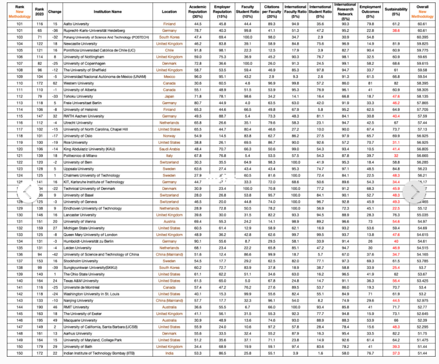 2023年,排名有6个指标:学术声誉占比40%;雇主声誉占比10%;单位教员论文引用数量20%,师生比例占比20%,国际教师比例5%,留学生比例5%。