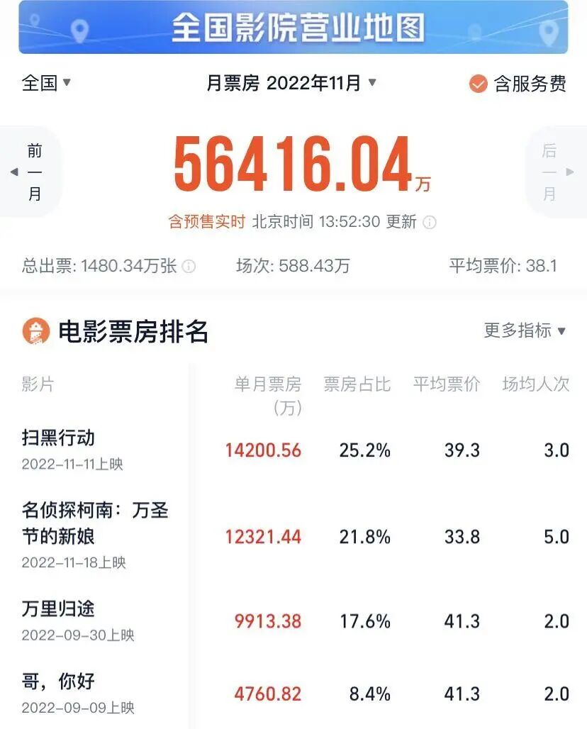 灯塔专业版数据则显示,截至11月30日13时52分,11月全国票房仅为5.6亿元——作为对照,2021年11月全国票房为18.74亿元,2020年11月全国票房为18.82亿元。11月破亿的影片仅有《扫黑行动》(1.4亿)和《名侦探柯南:万圣节的新娘》(1.2亿),排在11月票房榜第三名的《万里归途》票房9000万,但该片于9月30日上映,是一部国庆档的“老片”,一部“老片”有这么大的后劲一定程度上说明11月市场片源供给不足,缺乏有竞争力的头部大片。