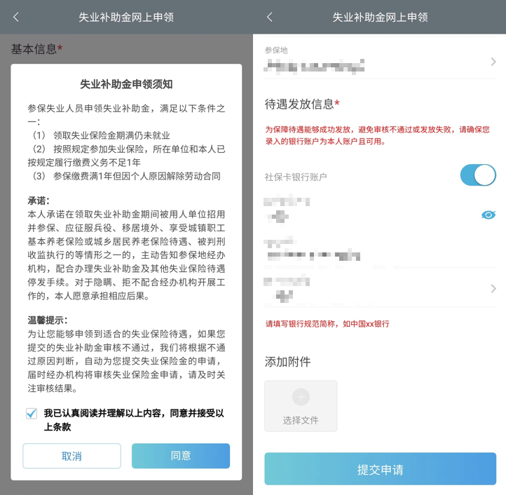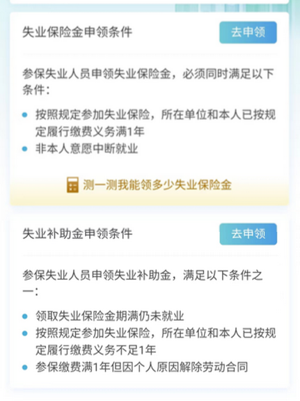 在服务页面“失业保险金申领条件”右侧点击“去申领”,阅读申领须知后,填写相关信息,上传相关材料后点击“提交申请”即可完成申请。