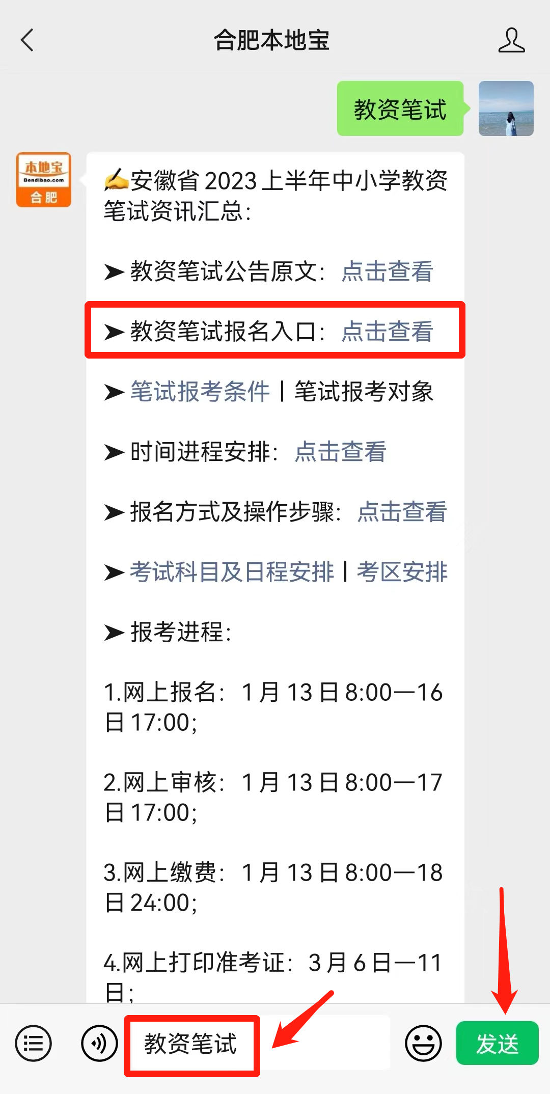 👉肖肖提示:点击下方公众号名片,关注合肥本地宝,关注后在对话框内回复【教资笔试】即可获取教师资格证笔试报名入口、笔试安排最新消息。