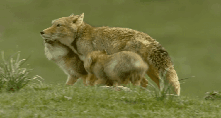 成年的雌雄藏狐轮流照看幼崽、觅食