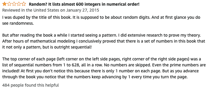 “我被书名骗了...我以为里面是随机数,但是看了一会儿后我发现还是有规律的…在做了好几个小时的数学模拟后我证明…每页左上角的数字可以形成1-628的递增序列。”